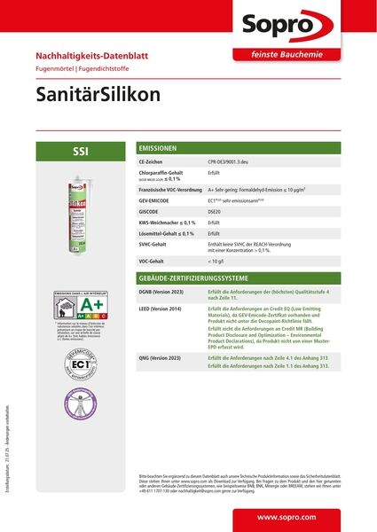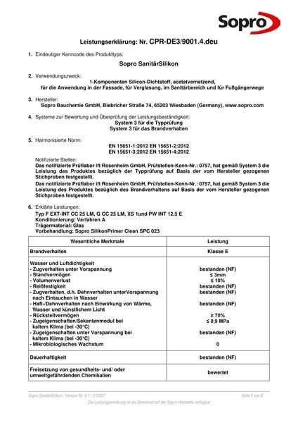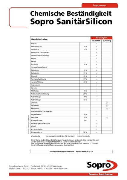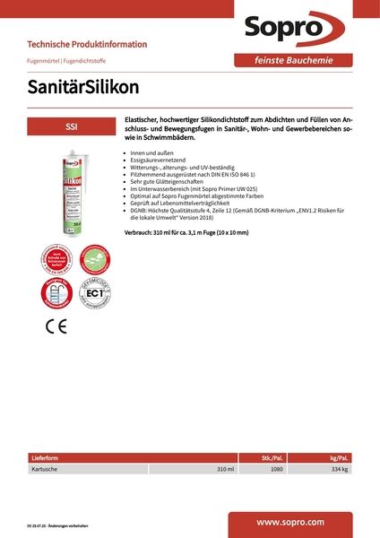 Sopro KeramikSilicon ist ein gebrauchsfertiger, spritzfähiger, essigsäurevernetzender Silicondichtstoff zum elastischen Füllen von Anschluss- und Bewegungsfugen im Keramik- bzw. Sanitärbereich wie zwischen Fliesenbelag und Badewanne, Brausetasse, Wasch- oder Spülbecken, WC-Becken und Urinalen. Zum Verfugen im Bereich von Türzargen und Fensterrahmen, in aufsteigenden Ecken und zwischen Wand- und Bodenbelag (Rundumfuge) im Innenbereich.